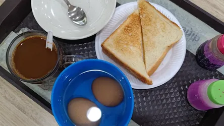 點了一份新加坡日常早餐-兩片烤麵包、兩粒半生熟鴨蛋和咖啡